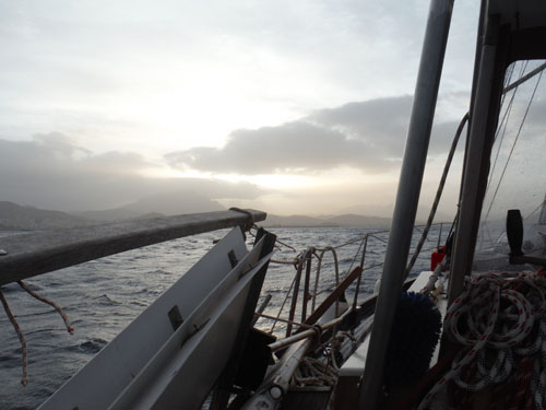 Seuraavana päivänä tuuli on kääntynyt myötäiseksi ja pääsemme lopulta purjehtimaan ilman moottorin pörinää. Purjeen säätöjä ei kovin usein tällä matkalla tarvita: isopurjeen nosto, preventterien tiukkaus (estävät vahinkojiipin eli puomin syöksymisen veneen väärälle puolelle), isopurjeen reivaus eli pienennys tuulen noustessa ja reivauksen purku tuulen heiketessä, halssin vaihto (purjeiden vaihto toiselle puolelle venettä, jotta kuljemmme oikeaan suuntaan). Ruori otetaan käsiohjaukselle vain purjemanöövereiden ajaksi ja satamaa lähestyttäessä. Tuuli pysyy mukavana koko loppumatkan eli 8-14 m/s, kunnes viimeisenä päivänä heikkenee niin, että loppumatkaksi otamme taas koneen purjeiden avuksi. Konetta joudutaan muutenkin käyttämään öisin pari tuntia sähkön riittämiseksi, autopilotti on aikamoinen virtasyöppö.