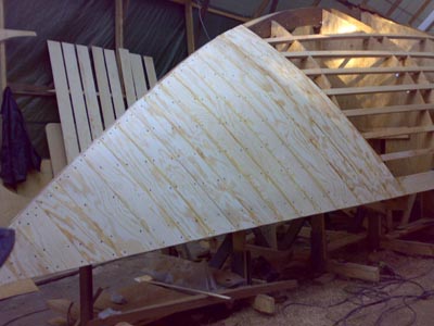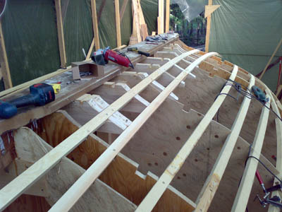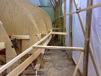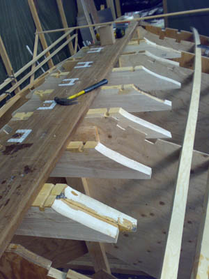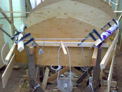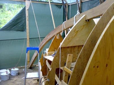höyläpenkkinä. Keulan iroko tukkia rakennettiin pitkään ja hartaasti, mutta siinähän se on menossa paikoilleen. Jopa katos kesti köysien painon . |