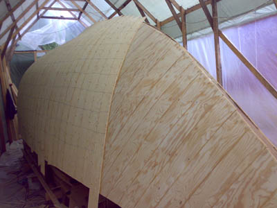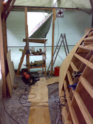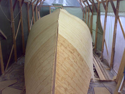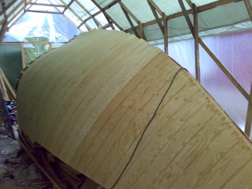 27.4.-08 Viimeinkin yö pakkaset loppuivat ja uskalsi aloittaa tuon rungon liimaamisen. Yllättävän hyvin tuo 6,5mm soiro taipuu noihin muotoihin. Mutta tuskallisen hidasta touhua, jokainen soiro täytyy erikseen höylätä ja sovittaa ennen liimaamista. Reilu neljännes ensimmäistä kerrosta menossa... Olosuhteet olleet ihanteelliset, lämpötila 17 astetta kosteus 40-55 prosenttia |