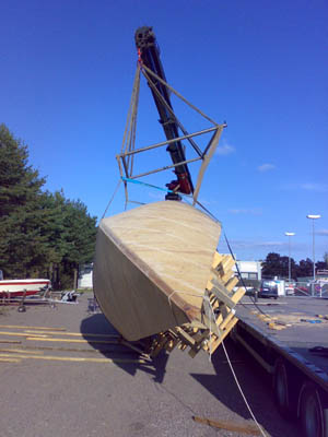 Nyt tuo hermoja raastava päivä on alkanut ja veneen tekele lähtenyt matkalle kohti Helsinkiä. Sää sentään suosi ja aurinkokin näyttäytyi... luultavasti. Ahtaasta kolosta Kaitzu onnistui nostamaan rungon kyytiin ja koko tien leveyshän siinä täytyi käyttää, mutta onneksi mahduttiin. Kuvat on Maijun ottamia ja hän jännitti koko hommaa vähintäänkin yhtä paljon kuin itsekin. |