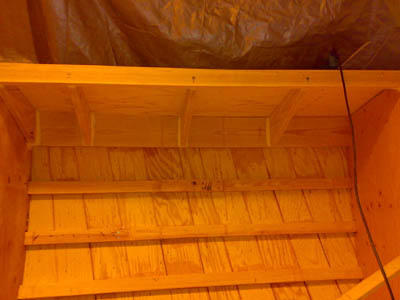 22.9.2008 Nopeasti katos päälle ja purkaen väliaikaiset mallilaipiot sekä kaikki muut tuet. Jäljellä vain nuo jäävät 24mm laipiot. Pressu vielä suoraan rungon päälle niin sisällä pysyy lämmin paremmin, eikä tarvitse pelätä katoksen vuotamista. |