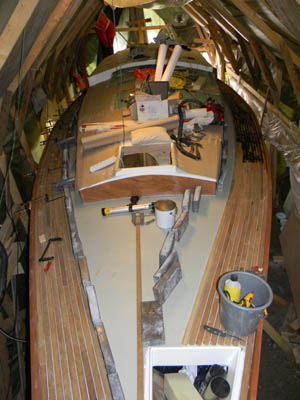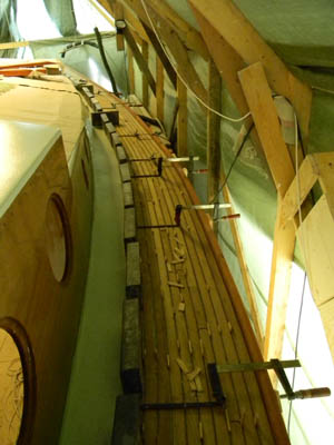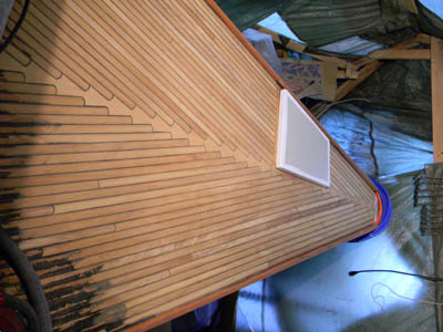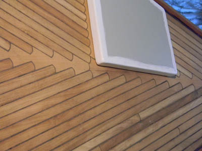 keskelle oli oikein hauska rakentaa. Leivinpaperi kannelle ja siihen piirretty lyijykynällä rimojen päät, jonka jälkeen hahmoteltu tarvittava palikka saumavaroineen, leikattu ja siiretty lankun päälle ja sahattu. Joka sauma on ensin putsattu pursuneista pohjamassoista ja sen jälkeen saumaus. Mutta nyt kun keulakansi ja sitloodan pohja on jo hiottu puhtaaksi niin lopputulos on kyllä tuon vaivan arvoinen. Eikä muuten taida tulla samanlaista kantta vastaan ihan pian ;-) |